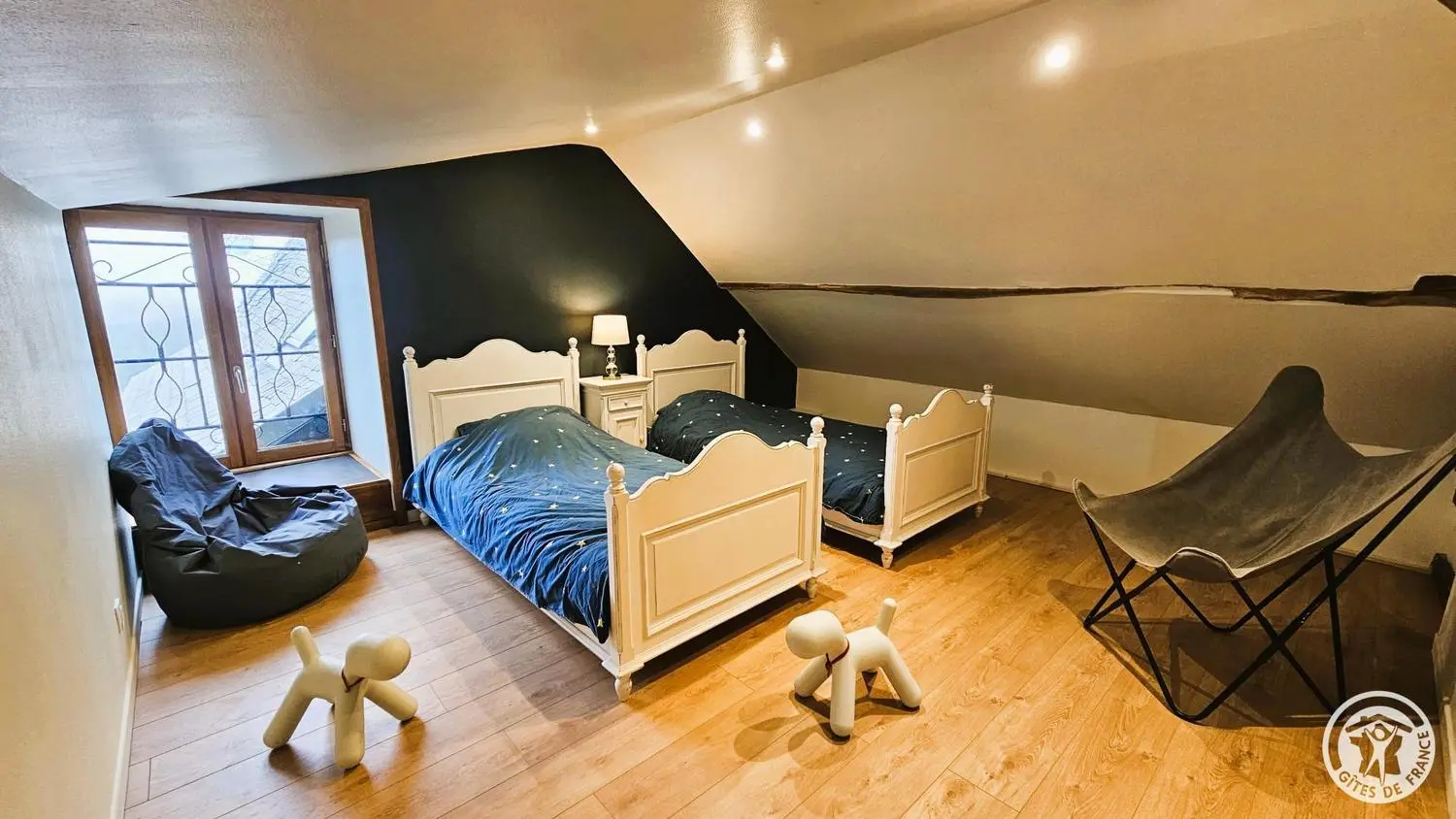 L'escalier à côté de la cuisine conduit à la troisième chambre, aménagée avec deux lits en 90 cm. Depuis le salon, un escalier à pente prononcée donne enfin accès à une mezzanine avec un canapé-lit, parfait pour un couchage d'appoint.