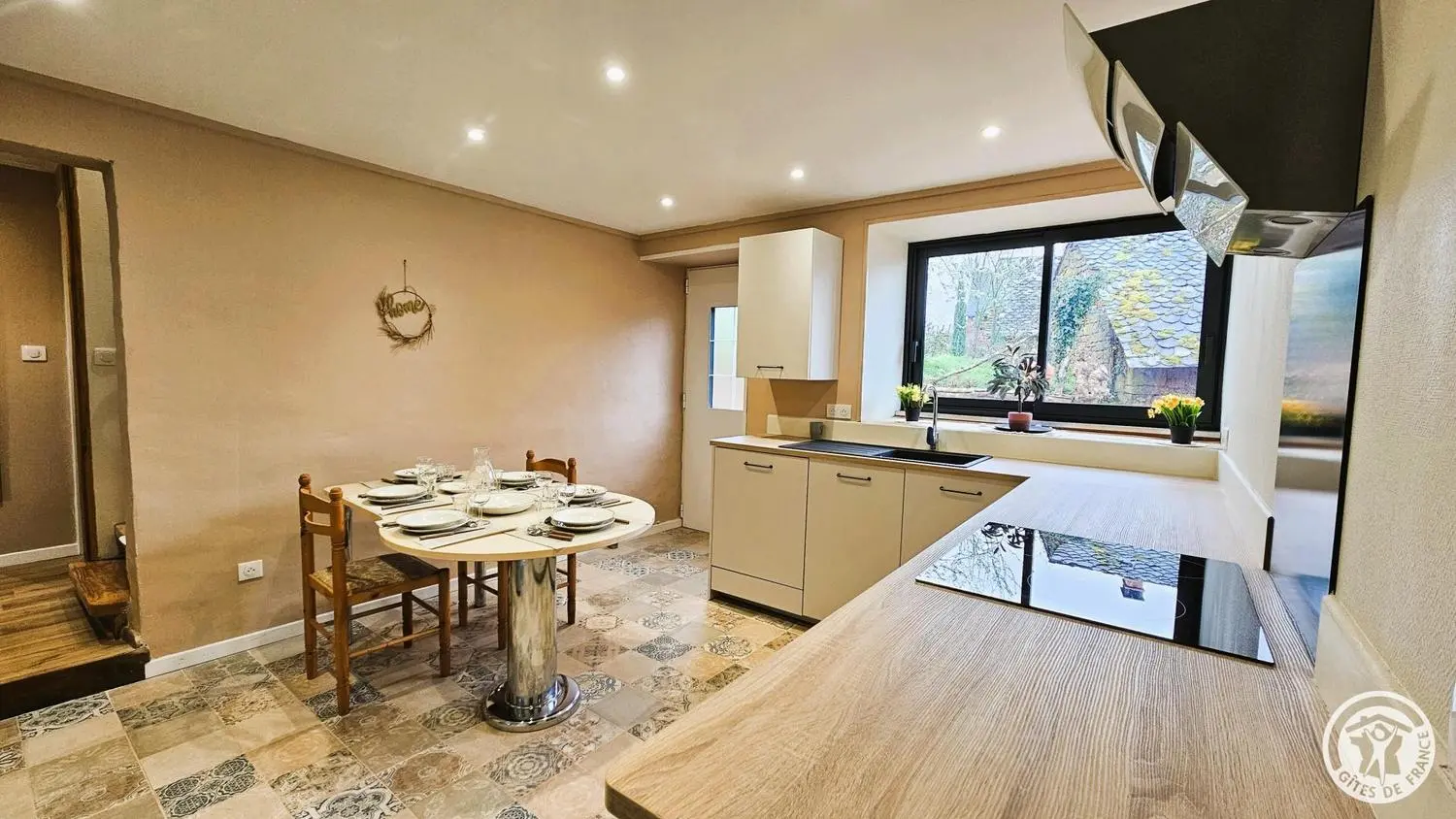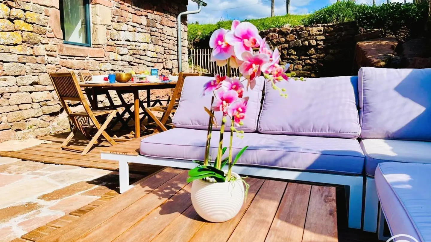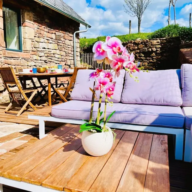 Après quelques marches, vous accédez au salon, également accessible depuis la cuisine. À l'extérieur, une terrasse équipée d'un salon de jardin invite à profiter pleinement du cadre.